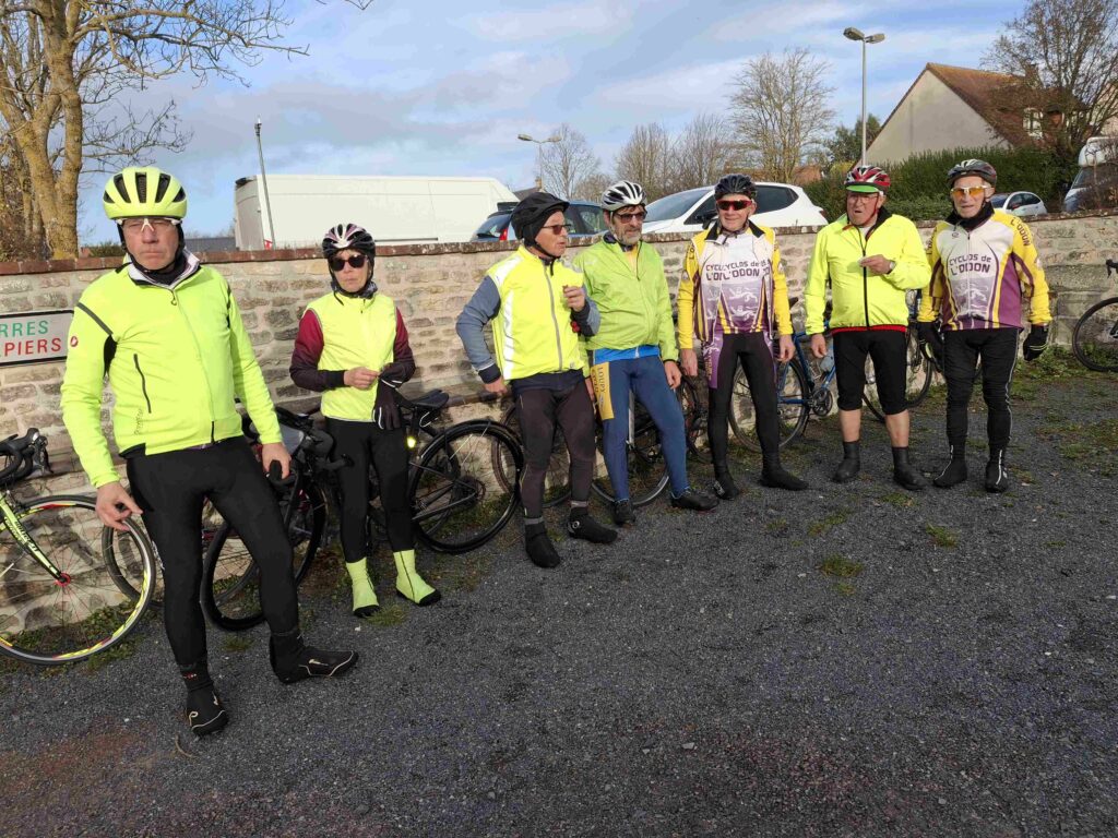 26 cyclos au départ : Jean-Marie, Bruno, Georges, Gino, Joël C., Ghislaine, Serge, Joël Go., Jean-François G., François, Michel, Joseph, Bernard, Rémi, Yvette, Jacques, Martial, Pascal M., Philippe M., Gérard P., Patrice, Didier R., Yves, Marcel, Pierrot et Alain.